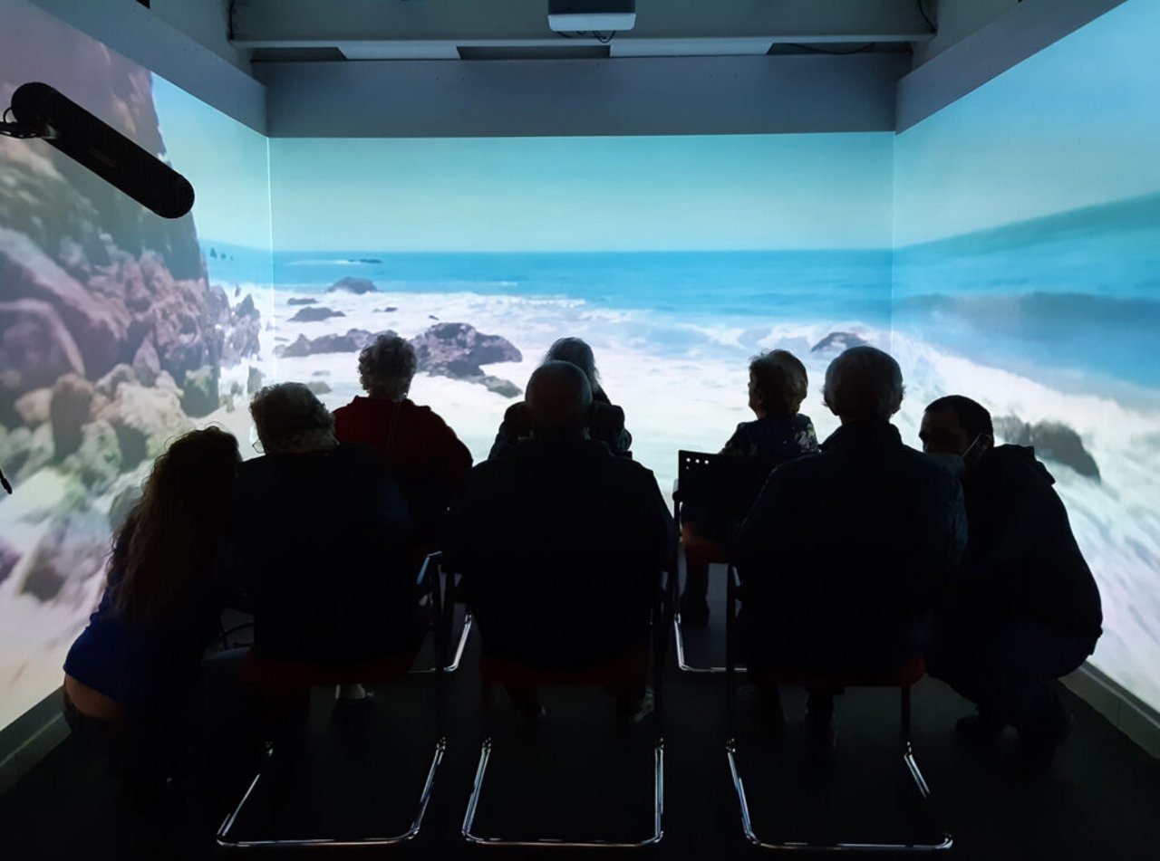 In questa e nelle altre immagini: momenti di sperimentazione in ambiente virtuale con pazienti Alzheimer, ripresi a novembre 2021 nell’ambito del documentario “L’acqua non muore mai” (regia B. Roganti).
