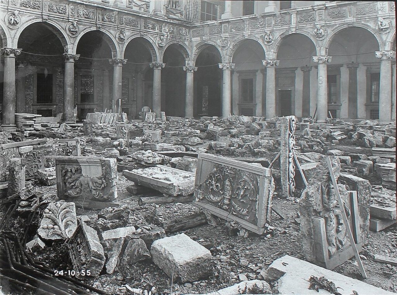 La seconda fase del restauro fu decisamente più impegnativa: il recupero del Cortile d’onore. Il restauro venne effettuato con la tecnica dell’anastilosi ossia la ricostruzione minuziosa del manufatto attraverso i pezzi originali. Una tecnica promossa anche dalla Carta del restauro di Atene del 1931: “quando le condizioni lo permettono, è opera felice il rimettere in posto gli elementi originari ritrovati (anastilosi); e i materiali nuovi necessari a questo scopo dovranno sempre essere riconoscibili.”