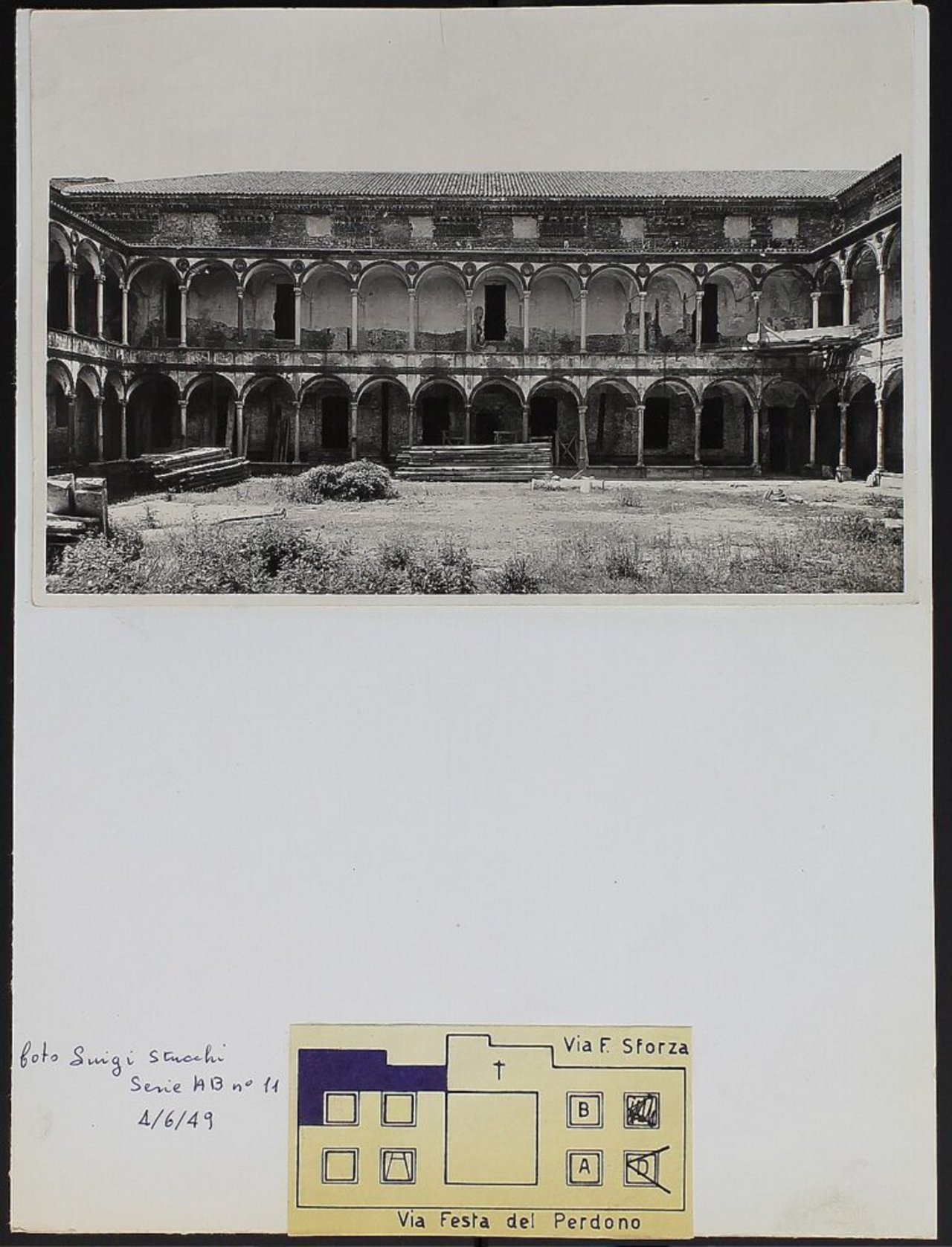 Tra l’ottobre del 1942 e l’agosto del 1943 Milano viene bombardata dalle forze angloamericane: fabbriche, stazioni ferroviarie, siti militari strategici ma anche edifici religiosi, artistici e scuole sono l’obiettivo degli Alleati. In particolare le bombe cadute tra il 13 e il 16 agosto 1943 causano il crollo parziale della facciata di via Festa del Perdono, la distruzione del Cortile d’onore e dei portici e gravi danni dei chiostri.