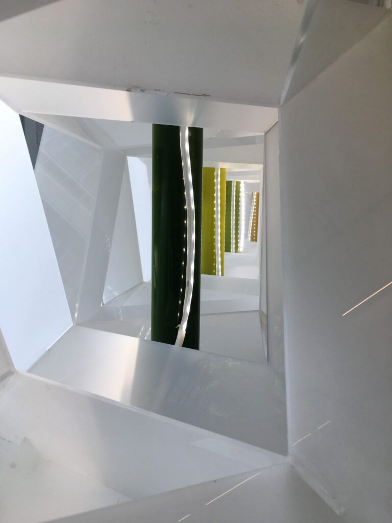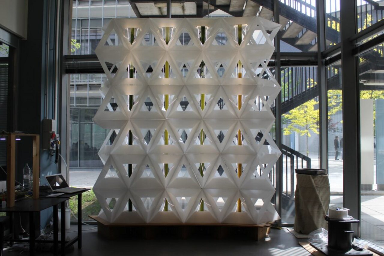 The initial idea was conceived at the exhibition “999. Una collezione di domande sull’abitare contemporaneo” (999: A Collection of Questions on Contemporary Living), which was held at the Milan Triennale, in which the Politecnico di Milano was invited to participate with an installation that served as the entrance to the event. The basic idea was to develop an element linked to nature: researchers and PhD students initially started with the idea of using pots with earth, then the idea of hydroponic cultivation. But after meetings with biologists from the State University of Milan, it was decided to try to design something using microalgae.