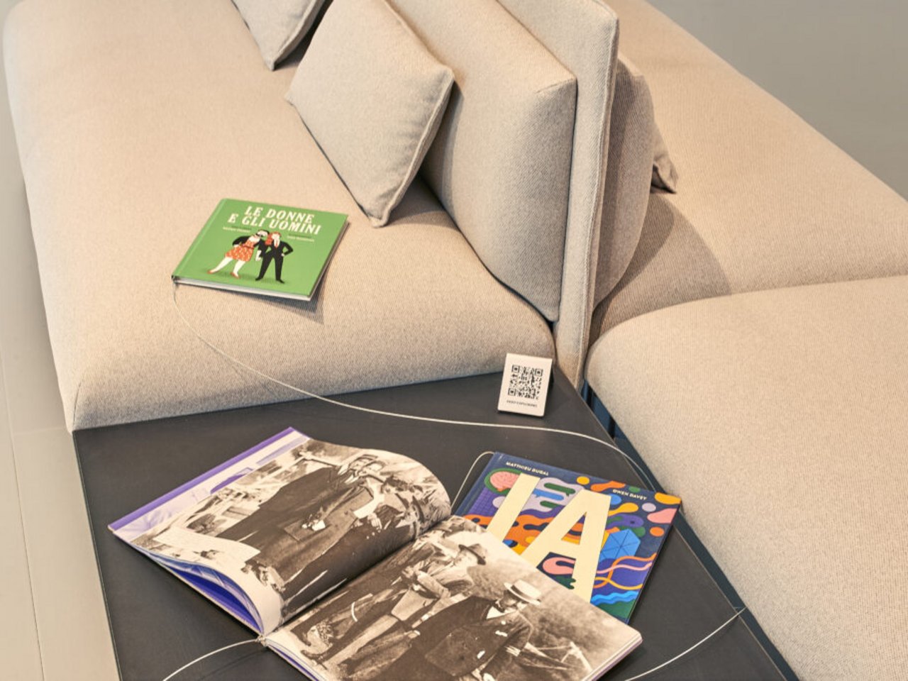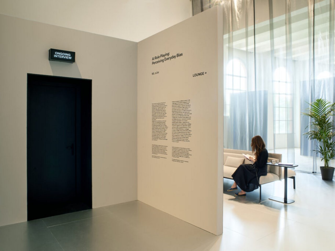 Ilaria Bollati: You enter through a translucent curtain, a threshold that separates and prepares the visitor. First, there is a discreet waiting area: neat seating, low tables, books to browse. It is an invitation to knowledge as a spontaneous gesture. At the back, the opacity of a mirrored wall increases, reflects, and then fades, alluding to the multiple unconscious filters and biases that cross our view of reality. Then you continue on. You sit in front of the three avatars, and the interview begins.